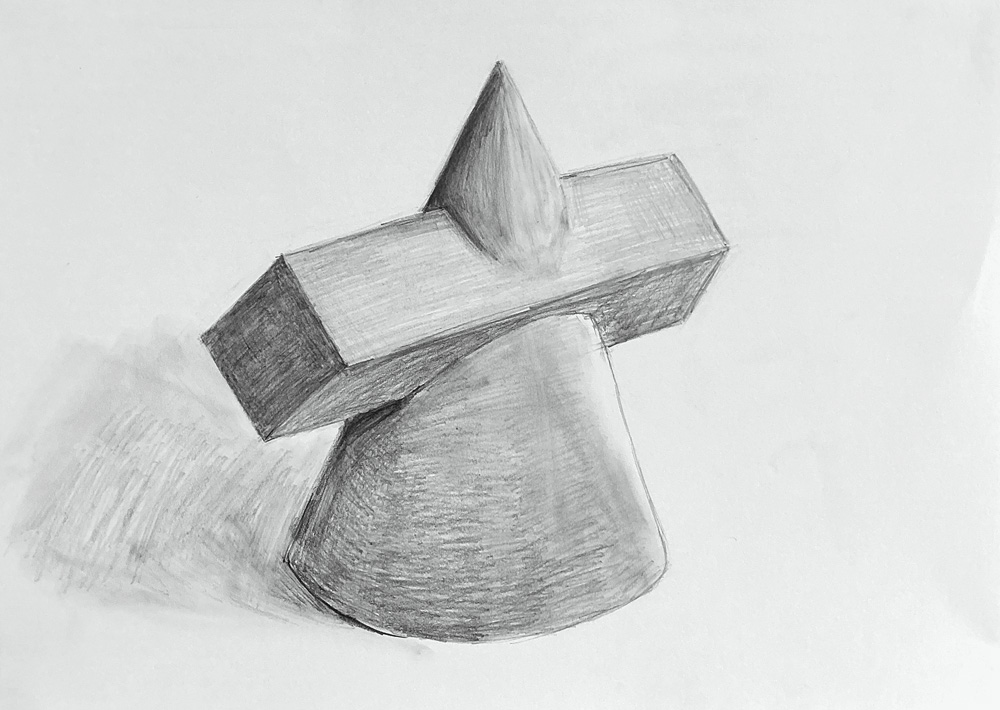 2枚目から5枚目のものは、4種類の幾何石膏像を1枚30分と時間を決めて描いたものです。透視図法の授業を受けたことで、頭ではルールを理解していても、短時間で対象物を観察し、画面上で再現することは、一朝一夕にできることではありません。みんな、かなり苦戦していました。