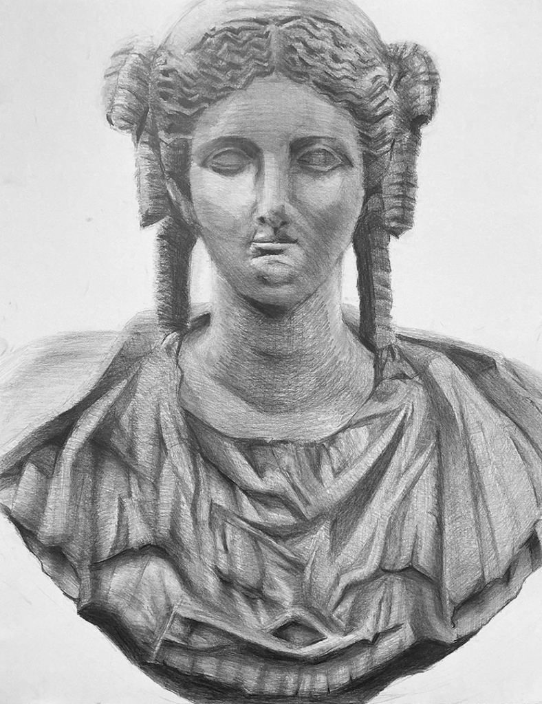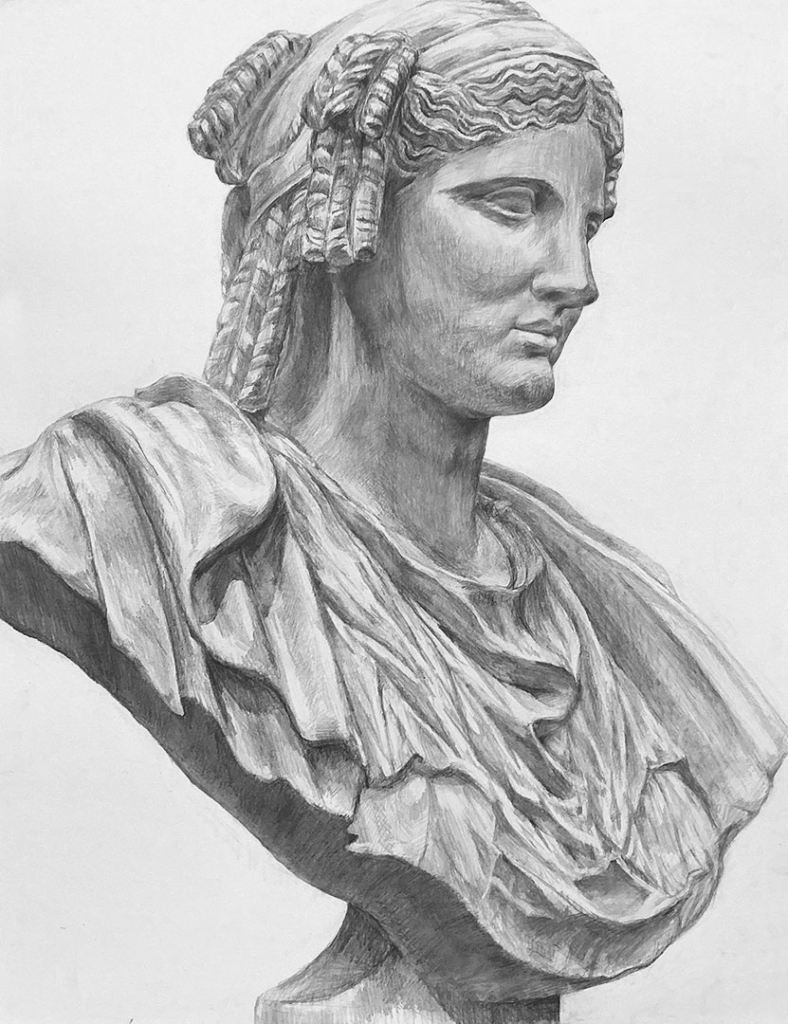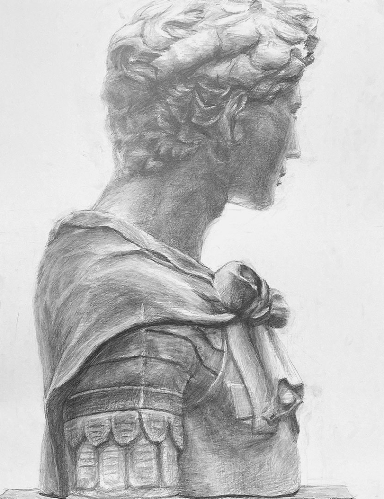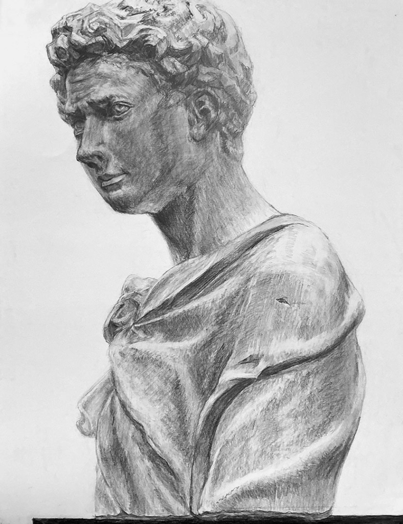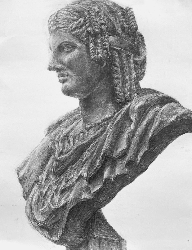 実際の美大入試、とくにデザイン系の入試では、鉛筆によるデッサンが課されます。木炭デッサンで身につけたことを、鉛筆デッサンに応用して、なおかつ、細かなところまで描写できる素材の特質を活かして、密度のある表現を目指しました。